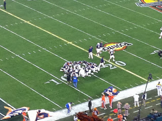 As the team takes the field, this is a familiar sight. They circle up and kneel in prayer. I can't say where each player stands spiritually, but I will say that I have seen this scene consistently when attending Auburn games. In my opinion, I believe that the coaches and staff are teaching these boys more than football, and if that's the case, I am thankful for it.